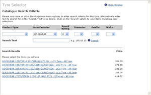Once the number of tyres and their position has been established the tyre catalog can then be used to find the correct tyre and its associated price, this is done by selecting “Search Tyre Catalog” which will display a search screen where the dimensions of the desired tyre can be chosen.